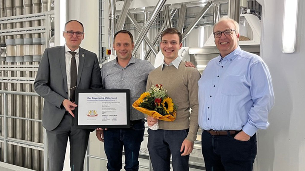 Der bayerische Müllerbund zeichnete die Albert Mühlschlegel GmbH & Co. KG als besten Ausbildungsbetrieb 2023 aus. Grund für die Ehrung waren die Bestnoten, mit denen der Weltgold-Azubi Valentin Blum seine Ausbildung abschloss. Und nicht nur das: kurz nach seinem Abschluss holte sich Valentin Blum auch den ersten Platz beim bundesweiten MühlenMasters. „Wir freuen uns,“ so Weltgold-Geschäftsführer Peter Mühlschlegel, „dass diese Ergebnisse unsere Ausbildungsphilosophie und das hervorragende Ausbildungsumfeld bestätigen.“